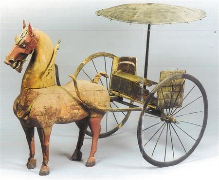 立馬俑高度約在50-90厘米之間,從西漢晚期至東漢晚期的墓葬中均有發(fā)現(xiàn)。由首、頸、軀干和四肢連接組成,腹部及四肢涂朱色底或白色底;用墨色、紅色繪眼、唇、蹄、韁繩和鞍。根據(jù)墓葬出土馬俑情況可知,雖然年代久遠,馬俑保存狀況不甚完整,但各個時期都有一定的藝術(shù)特征。西漢晚期的立馬頸曲弧度大,頭小,下頜拉長,鼻翼分三到四層,翹尾,無馬鬃,外形似神馬,到東漢早期的立馬俑四腿叉立,挺胸揚尾、昂首嘶鳴狀,表現(xiàn)出駿馬企足千里之行的蓄勢待發(fā)神態(tài),再到東漢晚期,木馬的造型也發(fā)生了變化,表現(xiàn)手法回歸寫實,不再刻意夸張良馬式的特征。馬頭的形象真實而自然,在后腦和頸部嵌插著以前未表現(xiàn)過的黑色鬃毛。尾巴不再造作地高舉而是合乎情理地微舉著,這一時期雕刻的木馬不是超凡出世的神馬,而是生活中乘騎的良馬。從馬俑發(fā)展演變情況來看,逐漸由神馬外形演變?yōu)槿粘I钪械牧捡R形象,雕刻藝術(shù)趨于寫實化。