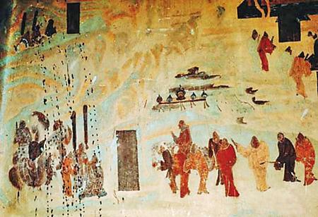 出土的高臺地埂坡胡人墓、西安安伽墓、史君墓、青海郭里木吐蕃墓棺板畫中都有關(guān)于商隊運營的場面,敦煌莫高窟壁畫、唐三彩中的胡商俑等,都為我們提供了生動的圖像資料。
