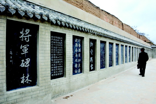 中岔古堡一堡三院,分為前院、中院、后院。走進(jìn)古堡,堡門左側(cè)建有戲樓,上書“中岔劇場(chǎng)”四字。戲樓(又稱戲臺(tái))始建于清光緒年間,上世紀(jì)六七十年代曾重修過。近堡門處右側(cè)堡墻下修建有兩處一體化的石碑長(zhǎng)廊一直通向后院,碑廊中石碑一塊接著一塊砌筑在青磚墻內(nèi),石碑與石碑之間以青磚分隔,上覆筒瓦和滴水防護(hù),每一通石碑上都刻有中華人民共和國(guó)將軍書寫的一幅書法作品。第一通石碑上甘谷籍將軍張臣剛書寫的“將軍碑林”四字分外醒目,劉精松、邢世忠、裴懷亮、李乾元等數(shù)十位叱咤風(fēng)云的共和國(guó)將軍書寫的書法碑刻依次嵌進(jìn)墻內(nèi),組成一個(gè)氣勢(shì)磅礴、雄偉壯觀的將軍書法長(zhǎng)廊,這就是新建的將軍碑林。