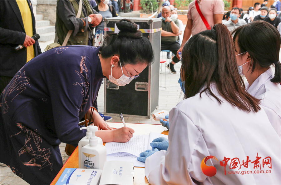 觀看演出人員在隍廟門口掃描“健康碼”,經(jīng)工作人員驗(yàn)證、測溫、登記后予以放行入場。演出場地人數(shù)達(dá)到150人之后,不再放行。所有觀看演出人員在工作人員引導(dǎo)下佩戴口罩、間隔就坐,保持1米以上距離。演出人員在臺上臺下也保持一定距離。