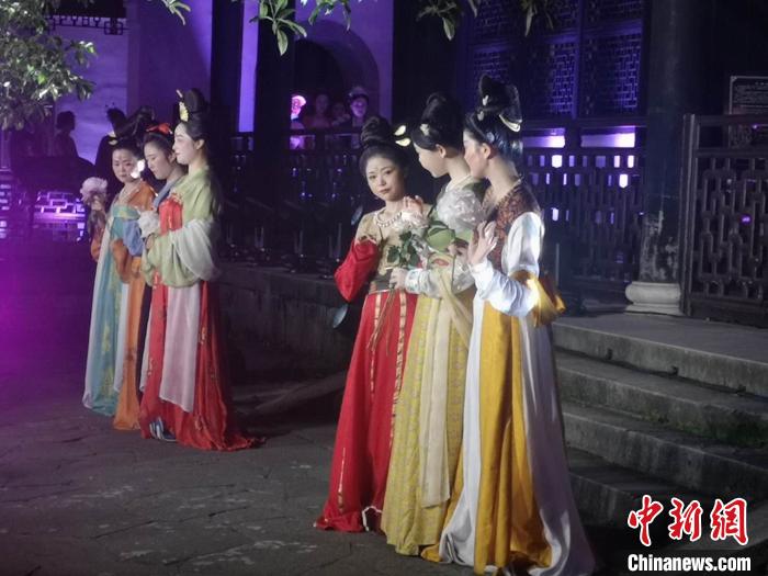 中新網(wǎng)杭州6月9日電(童笑雨)實景園林中還原杜麗娘游園驚夢場景,羅漢堂前身著傳統(tǒng)服飾的年輕人坐在蒲團上行飛花令,曼妙身姿在假山上演繹《采薇》獨舞……這是專屬于浙江省博物館的“奇妙夜”。