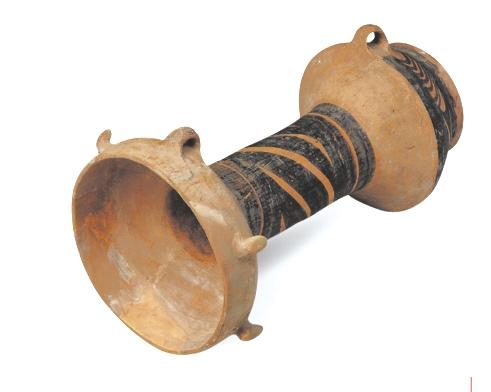 弦紋彩陶鼓 馬家窯文化馬家窯類型(距今約4800年),永登縣出土。這是一只陶鼓,鼓的兩端各有一耳,用于系繩,一端為喇叭口,另一端為罐形口,喇叭口外有六個爪突,用于固定鼓面。想必是用緊繃的獸皮做鼓面,這應是腰鼓的雛形,是迄今為止發(fā)現(xiàn)時代最早的打擊樂器。