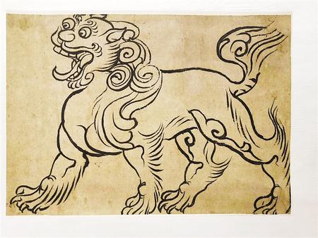 中國本無獅子,原產地是非洲和南美洲,約在漢武帝時才經西域傳入。獅子作為進獻的禮物,是敦煌壁畫中最早出現的動物形象之一。由于它的勇猛威儀備受佛教推崇,故在造像和壁畫中曾出現大量的獅子元素。除此,獅子形象還被吸納成為陵墓裝飾和傳統(tǒng)建筑的基本元素。這幅紙本畫,造型準確、健壯飽滿,昂首闊步、氣宇軒昂,線條遒勁、中鋒用筆,彈性十足,顯示出畫家嫻熟的造型功底,長短弧線勾勒卷毛,寥寥數筆,卻靈動活潑、灑脫不羈,為不可多得之線描精品。
