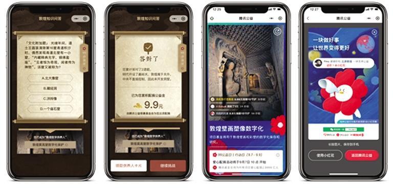 “云游敦煌”的“聲動(dòng)畫語(yǔ)”讓壁畫“活”了起來(lái),用戶可以通過(guò)觸點(diǎn)的方式進(jìn)入到不同的篇章中,通過(guò)動(dòng)畫欣賞敦煌壁畫中晚唐時(shí)期的生活場(chǎng)景,并獲得與當(dāng)時(shí)社會(huì)民俗、服飾等相關(guān)的文化知識(shí)。觀看完動(dòng)畫后,用戶還可以通過(guò)參與文化問(wèn)答挑戰(zhàn),為中國(guó)敦煌石窟保護(hù)基金會(huì)募集善款。答對(duì)題目越多,募集到的善款也將隨之增多??铐?xiàng)將由騰訊公益慈善基金會(huì)直接出資,并全部用于敦煌莫高窟第427窟、145窟、138窟的數(shù)字化保護(hù)工程。通過(guò)這種方式讓每一位參與的用戶,都能夠用自己的知識(shí)為石窟數(shù)字化保護(hù)助力,成為新時(shí)代的敦煌“數(shù)字供養(yǎng)人”。
