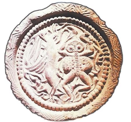 陜西淳化縣博物館收藏著一枚蟾蜍玉兔紋瓦當(dāng)。這枚蟾蜍玉兔紋瓦當(dāng)是國家一級(jí)文物,出土于咸陽市淳化縣西漢甘泉宮遺址。瓦當(dāng)面分上、下兩部分,上半部浮雕的是一只疾奔的小兔,兩前足躍起,雙耳后豎,尾巴上翹;下半部是一只起跳的蟾蜍,圓目突起,大腹鼓圓,舌長伸。瓦當(dāng)造型生動(dòng)傳神,極富生活情趣。在我國古代神話傳說中,蟾蜍、玉兔是月宮里的動(dòng)物,這個(gè)構(gòu)圖無疑是取自嫦娥奔月的神話故事。
