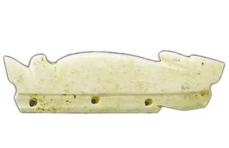 目前所見最早的玉兔有安徽含山凌家灘遺址出土的兔形飾件,其屬于凌家灘文化,距今5300年。該玉料受沁呈黃白色,飾件由兔形的上部和榫形的下部組成,兔呈伏臥狀,但無足部表現(xiàn),嘴前伸,耳朵向后伸,背部呈弧形上凸,尾巴既似兔子又若魚,上翹分叉;榫部長條形,上面對(duì)鉆成四孔。