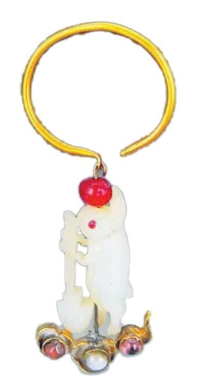 北京市昌平區(qū)十三陵定陵地宮明代定陵孝靖皇后的棺內(nèi),有一對(duì)金環(huán)鑲寶石玉兔耳墜。該金環(huán)鑲寶石玉兔耳墜中,兔子直立,雙耳上豎,玉色青白細(xì)潤,以紅寶石嵌飾雙眼,兩前爪抱杵作搗藥狀,下有臼,兔身上以細(xì)密陰線刻出毛發(fā)。