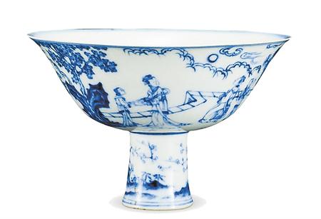 我國自古就有賞月祭月的習(xí)俗,這一習(xí)俗在文物里也有體現(xiàn),湖北省博物館收藏了一件青花瑤臺(tái)賞月圖瓷鍾。瓷鍾通高10.1厘米,口徑15.5厘米,足高4.6厘米,足徑4.2厘米,屬官窯出品,白胎,胎質(zhì)細(xì)膩,器壁光亮胎薄,叩之其聲如磬。瓷鍾上繪有“瑤臺(tái)賞月圖”,三組人物故事現(xiàn)于瓷鍾外壁:第一組有一老婦人側(cè)身坐在石墩上,身后站一侍女,雙手持扇,老婦對(duì)面站一年輕女子,其右側(cè)立一童子。第二組和第三組各有一青年女子和丫環(huán),畫面還有遠(yuǎn)山、祥云和花草。“瑤臺(tái)賞月圖”紋飾在瓷器界又被稱為“人物紋”,較為罕見,圖中人物共賞天上一輪圓月,與宋人所繪《瑤臺(tái)步月圖》一脈相承,意境優(yōu)美,風(fēng)格清新動(dòng)人。