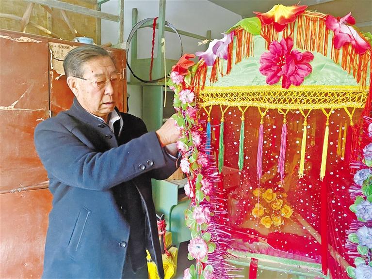 除了編排社火曲目,閆文發(fā)還親手制作道具。“有的道具貴,或者買不上,我就自己琢磨、自己做。”花轎、旱船、白龍馬……做得惟妙惟肖。“我們的曲目需要啥道具,閆老師都能做,手特別巧,給社火隊(duì)節(jié)約了不少成本。”隊(duì)友張吉榮對(duì)閆文發(fā)的手藝贊不絕口。