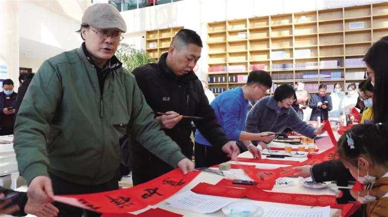 活動(dòng)中,蘭州畫(huà)院和市文化館的10余位書(shū)畫(huà)家提筆蘸墨、盡情揮毫,為新區(qū)圖書(shū)館精心創(chuàng)作了美術(shù)作品,并為聞?dòng)嵹s來(lái)的眾多新區(qū)居民現(xiàn)場(chǎng)書(shū)寫(xiě)了寓意吉祥的春聯(lián)和“福”字近400套(幅),在春節(jié)來(lái)臨之際為他們送上了美好的祝愿。