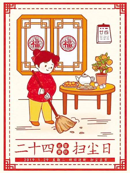 據(jù)《呂氏春秋》記載,這一風俗源于堯舜時代。臘月二十四那天,隴上人家就陸續(xù)開始打掃起來,全家老少一起動手,清掃房屋積塵,石灰刷墻,新紙裱糊仰塵,擦洗窗欞,糊上新窗紙,貼窗花或貼“窗孔子”(微型花鳥畫與書法),擦拭箱柜上的銅什件、器皿污垢,打氈抖土,拆洗被褥。一番流汗勞碌,居室煥然一新,過年的心情也更加舒暢。