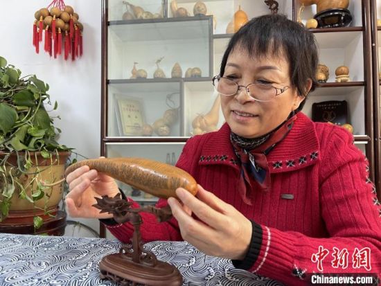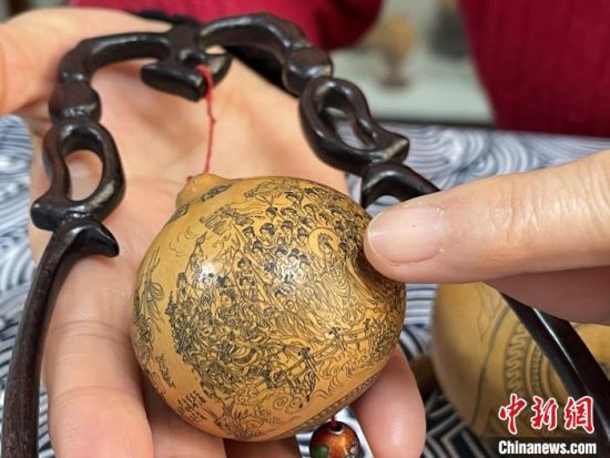 圖為長約二十公分的長條葫蘆雕刻佛教經(jīng)文作品。 張婧 攝