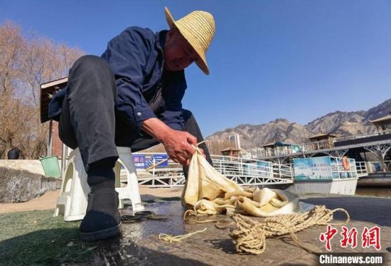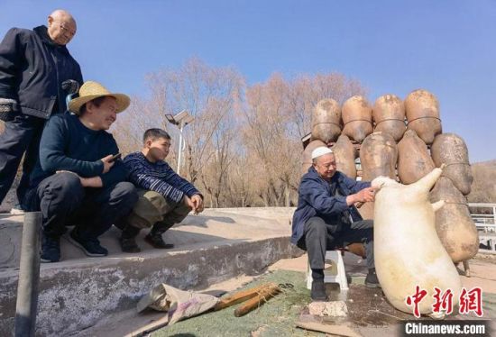 2月24日,春日暖陽下,今年70多歲的省級(jí)羊皮筏子非遺傳承人張德寶在蘭州黃河邊制作羊皮筏子,為迎接旅游旺季到來提前做好準(zhǔn)備。劉玉桃 攝