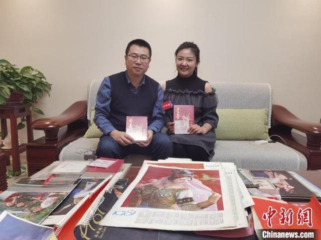 圖為陳曉斌(左)向中新網(wǎng)記者介紹他所收藏的舞劇《絲路花雨》相關(guān)珍貴資料情況?!〈蘖?nbsp;攝