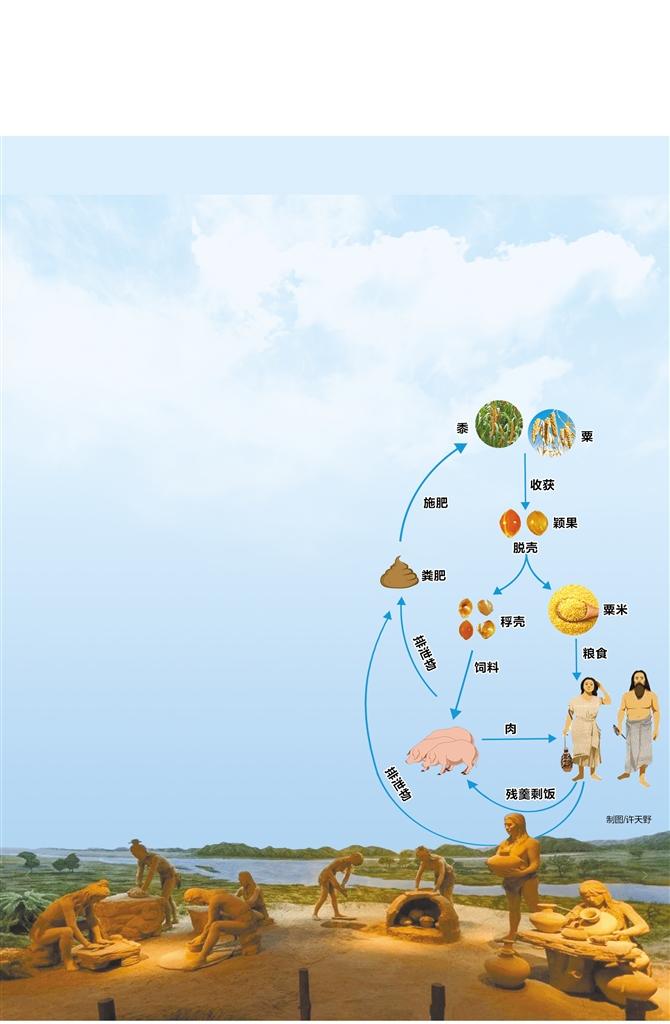 團隊從遺址出土的粟作農(nóng)業(yè)系統(tǒng)核心要素——粟、黍和家豬入手,通過豬牙表層殘留物中的淀粉粒和植硅體分析重建豬的食譜,通過粟、黍炭化種子的氮同位素分析追蹤農(nóng)田的施肥行為,發(fā)現(xiàn)在距今5500年前,大地灣遺址已經(jīng)形成了一種高度集約化的農(nóng)業(yè)模式:人吃粟米,豬吃稃殼;圈養(yǎng)家豬,收集糞便;豬糞肥田,維持地力,避免休耕,提高產(chǎn)量。