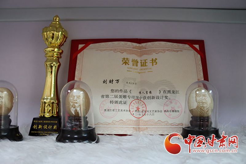 記者在采訪中注意到,社區(qū)的展柜一角擺放著不少獲獎證書,其中一張是在2021年的全國蛋雕專項展上,為劉財萬作品《偉人肖像》頒發(fā)的創(chuàng)新設計獎證書。“目前正在為全國蛋雕藝術聯(lián)展作準備”,當記者問起下一步打算時,劉財萬顯得信心十足。