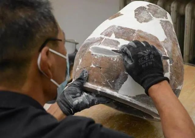 文物工作者對南佐遺址內(nèi)出土的陶器進行修復(fù)(8月25日攝)。新華社記者 李賀