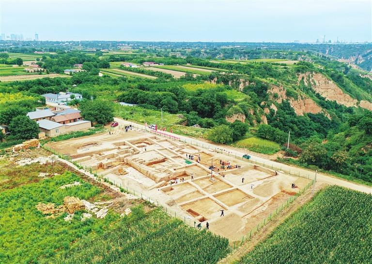 甘肅慶陽市南佐新石器時(shí)代遺址核心區(qū)大型宮殿建筑發(fā)掘現(xiàn)場(2022年8月23日攝)。