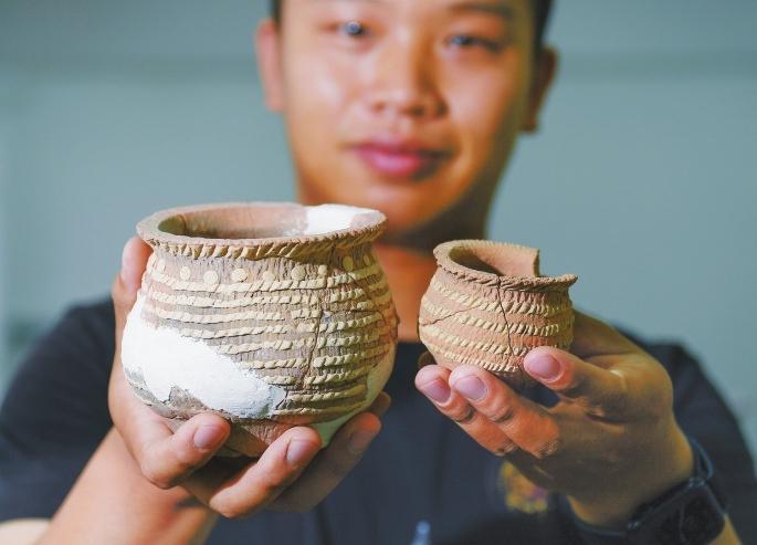 考古工作人員展示南佐新石器時(shí)代遺址內(nèi)出土的箍白泥附加堆紋夾砂陶罐。