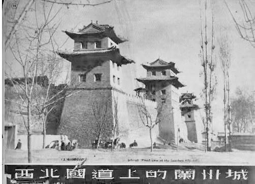 特別難得的是,他拍下了一張?zhí)m州城樓的照片,這是筆者見過(guò)的所有蘭州城樓中最壯觀的。照片上,中間的城門和兩個(gè)角樓并行排列,角樓前面是幾株西北地區(qū)常見的高聳挺拔的白楊樹,角樓底下是幾個(gè)正在等客人的黃包車夫。這座城樓是蘭州東郭城門迎恩門,俗稱東稍門(位于今東方紅廣場(chǎng)東口什字),中間有城門洞,南北兩側(cè)為角樓,無(wú)城門洞。