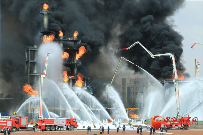 現(xiàn)場,爆炸聲浪一波未平,一波又起,黑煙滾滾夾雜火苗亂竄。在嚴(yán)峻考驗面前,消防隊伍采用先進技術(shù)壓制火力,發(fā)起總攻。最大程度模擬真實火災(zāi)場景,達到應(yīng)對復(fù)雜火災(zāi)考驗的能力。