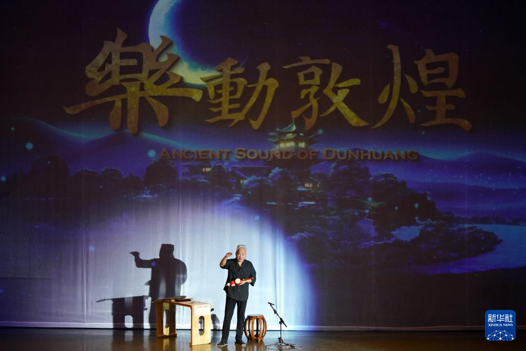 8月9日,在《樂動(dòng)敦煌》演出現(xiàn)場(chǎng),敦煌古樂全球推廣大使、國樂藝術(shù)家方錦龍?jiān)谙蛴^眾介紹傳統(tǒng)音樂。新華社記者 馬寧 攝