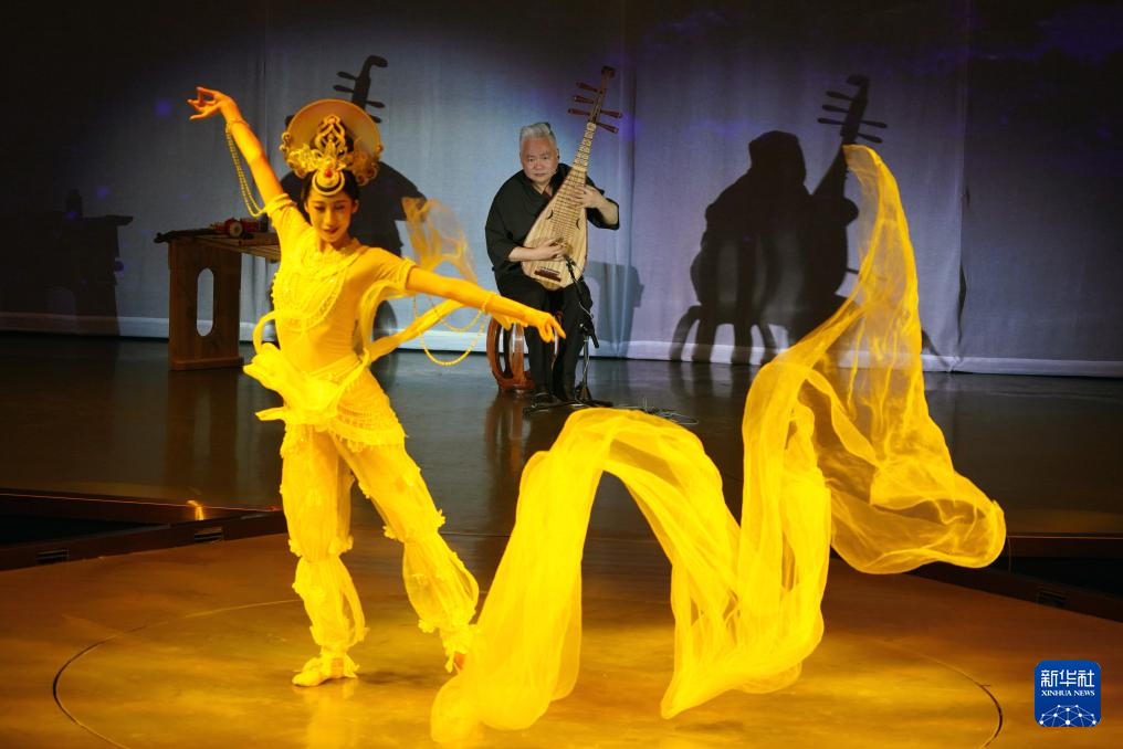 8月9日,在《樂動(dòng)敦煌》演出現(xiàn)場(chǎng),敦煌古樂全球推廣大使、國樂藝術(shù)家方錦龍演奏琵琶,為舞蹈演員伴奏。新華社記者 馬寧 攝