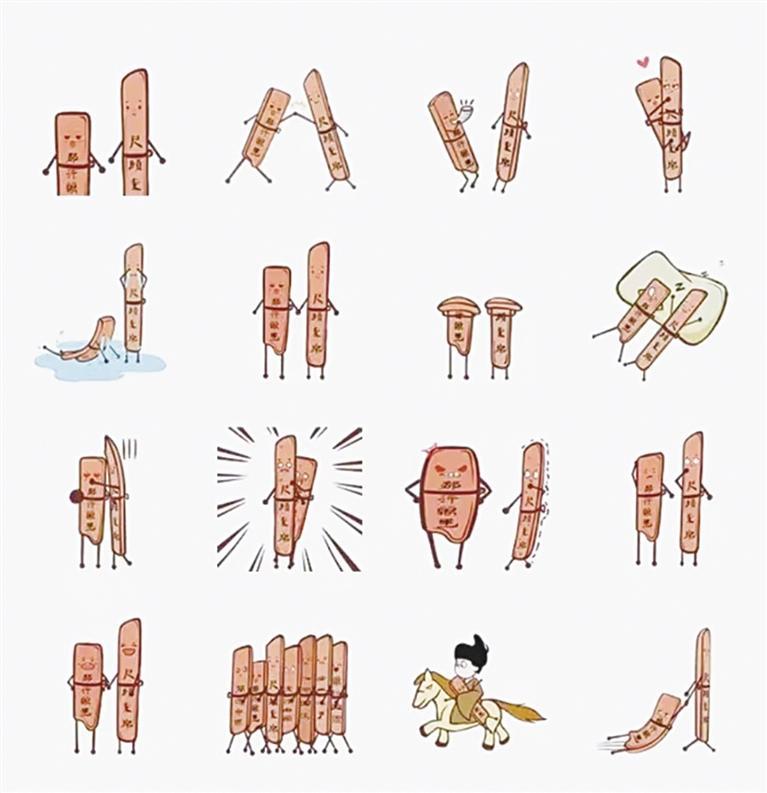 此次上線的簡牘表情包盡可能保留了簡牘原貌,一個(gè)個(gè)簡牘版簡簡和牘牘表情包長著小短腿和小短手,或擊掌或歡呼或大哭,動態(tài)十足,16組表情包各表其意,在萌趣中體現(xiàn)歷史文化,展現(xiàn)簡牘的魅力。