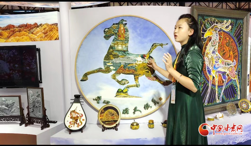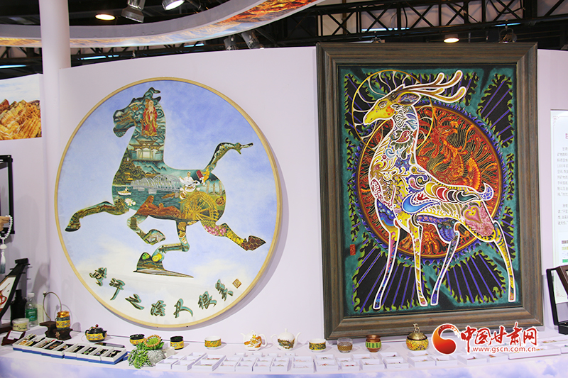 和阮琳的刻葫蘆一樣,由甘肅李明海琺瑯壁畫文化傳承發(fā)展有限公司展呈的“黃河之濱也很美”和靈動的九色鹿等充滿敦煌元素的掐絲琺瑯壁畫流光溢彩,精美絕倫,參觀問詢著絡(luò)繹不絕。