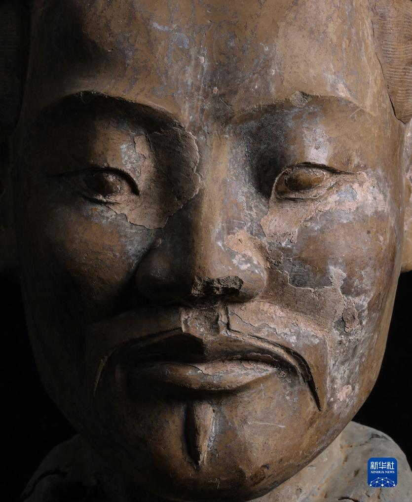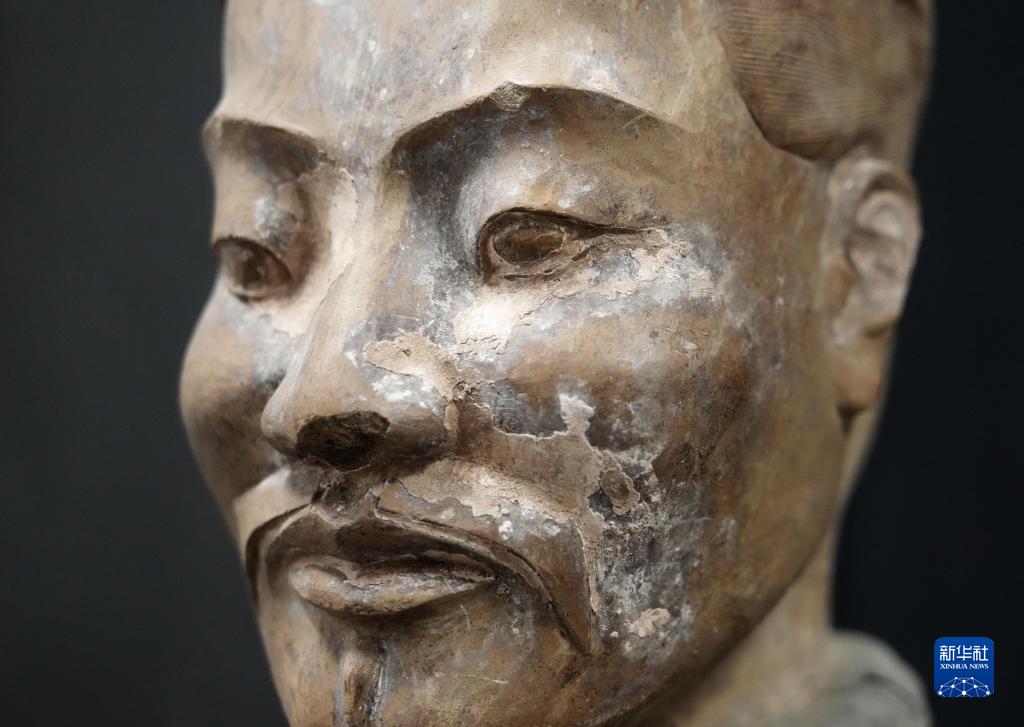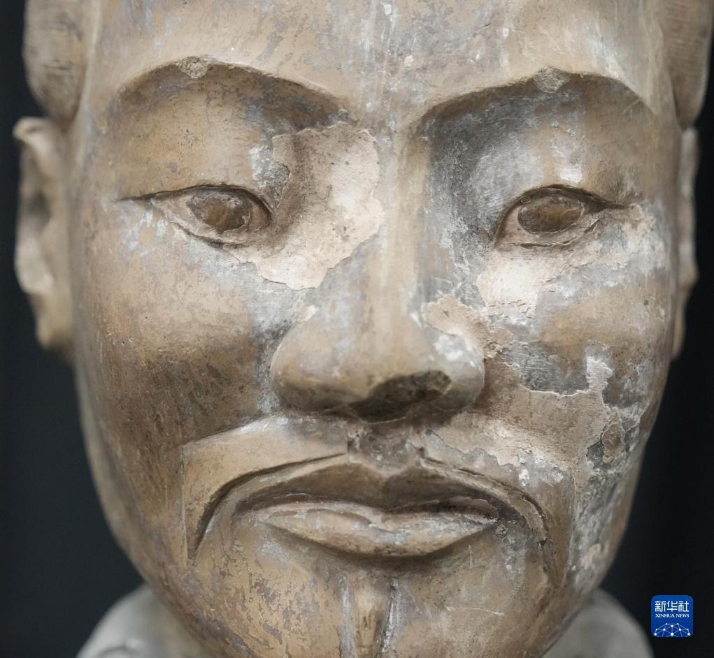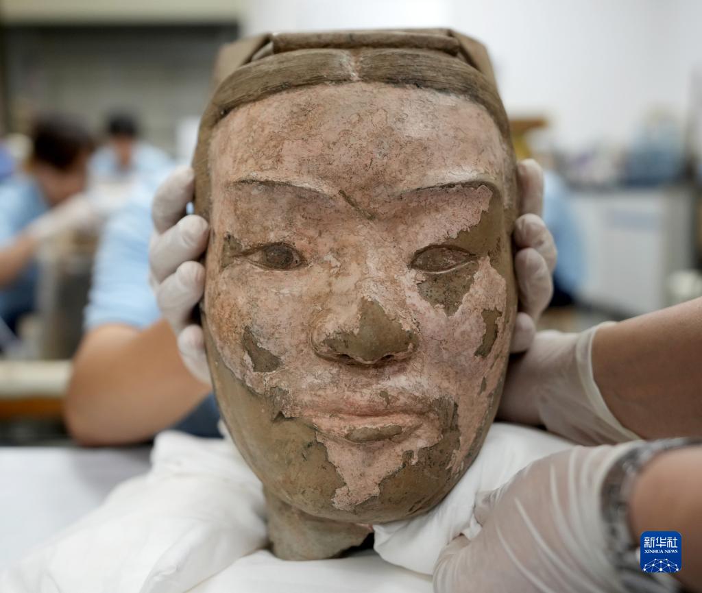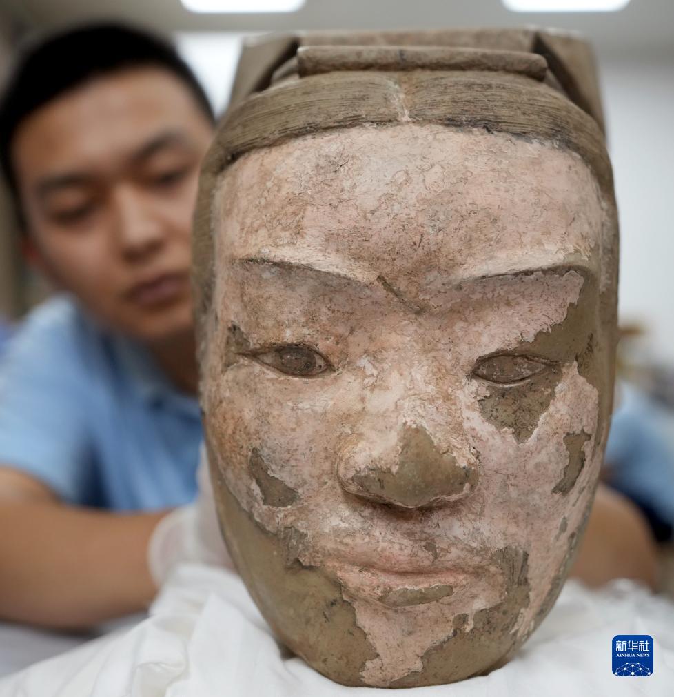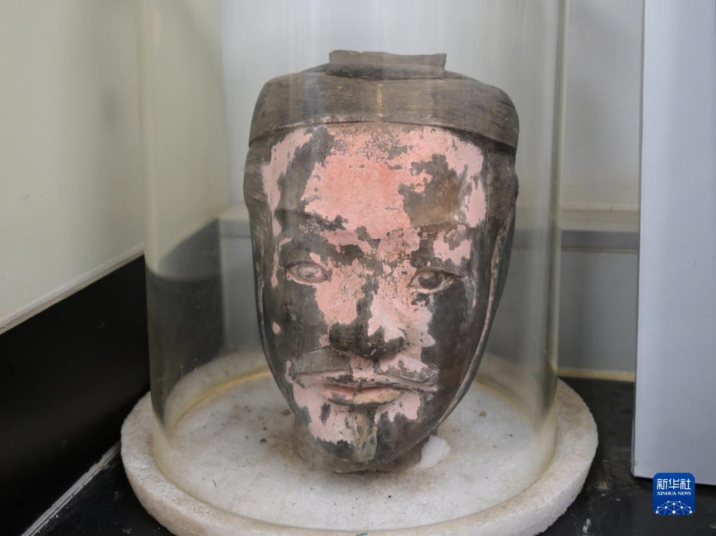 在秦始皇帝陵博物院文物保護(hù)部彩色陶俑修復(fù)室內(nèi),一尊秦俑臉部尚存部分彩繪層。秦俑五官的精準(zhǔn)塑造顯示出秦代匠人具有高超的寫(xiě)實(shí)能力(8月23日攝)。