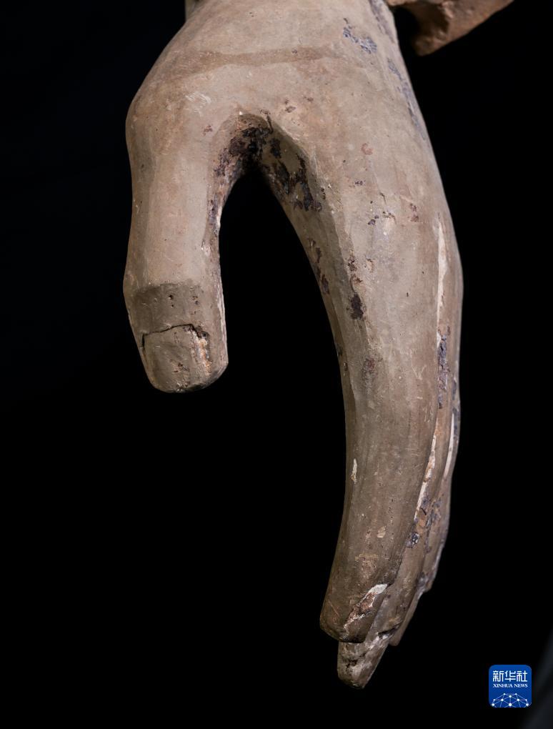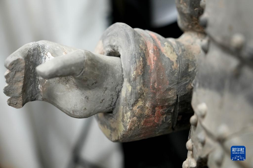 在秦始皇帝陵博物院文物保護(hù)部彩色陶俑修復(fù)室內(nèi),一尊秦俑的手部特寫(xiě)顯示出豐富的細(xì)節(jié)(8月23日攝)。