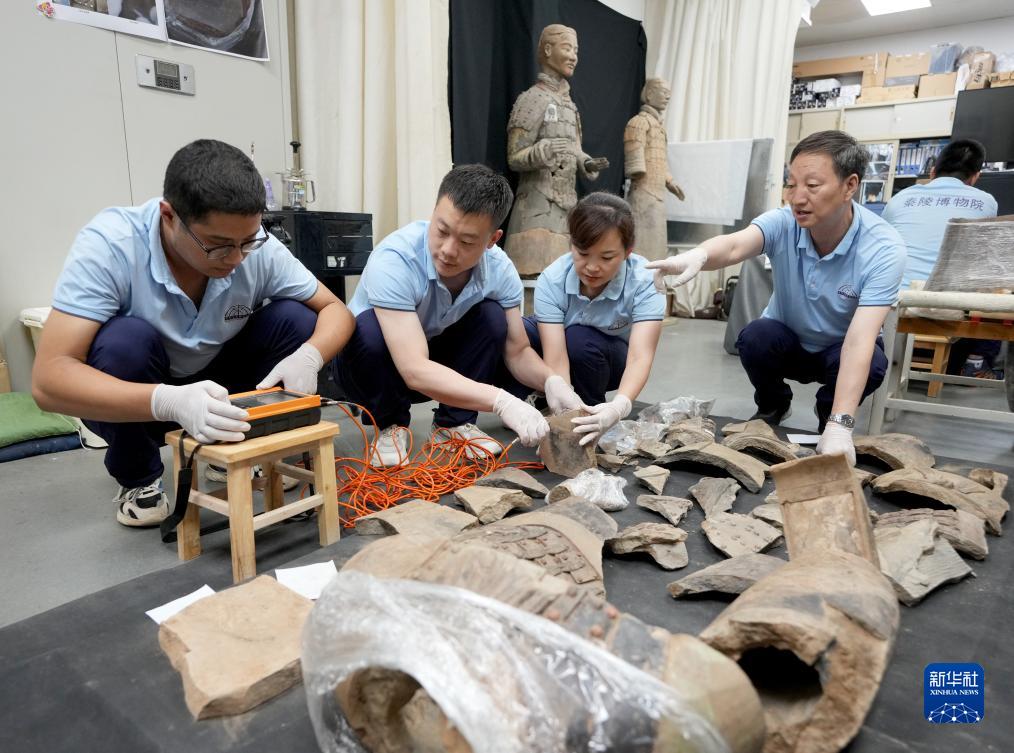 秦始皇帝陵博物院文物修復(fù)專(zhuān)家蘭德?。ㄓ乙唬┰谥笇?dǎo)技術(shù)人員運(yùn)用超聲波儀器測(cè)量秦俑胎體的密度(8月23日攝)。