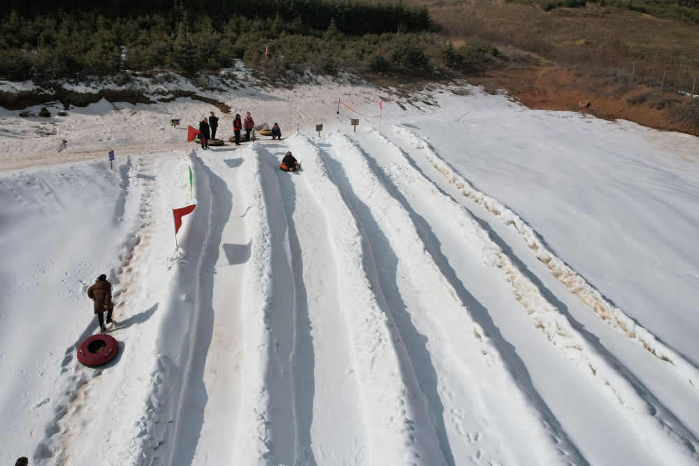 1月16日,在渭源縣田家河鄉(xiāng)元古堆村冰雪樂園,游客在滑雪圈。新華社記者 方欣 攝