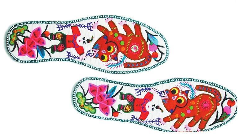 北方黃土高原,陜甘寧晉一帶,采用這種藝術(shù)縫制刺繡的衣物飾品有拼布藝術(shù)的鮮明特征,具有浮雕效果。其具體做法是將貼填繡畫(huà)相結(jié)合,有人叫做拼貼浮雕繡,在肚兜、枕頂?shù)鹊闹谱髦羞@種技藝采用最多。因?yàn)槎嗍钦w設(shè)計(jì),分部件制作,然后組合成一個(gè)完整的畫(huà)面在布上,所以叫“逗”,“逗”是秦隴方言,就是手指把不同部件小心拼合在一起組成圖案的動(dòng)作,因?yàn)椴计。⌒淖屑?xì),輕輕拼合,所以會(huì)“逗裹兜”“逗夾襖”的媳婦,就是心靈手巧的人,說(shuō)一個(gè)女性會(huì)“逗”,就是對(duì)她的女紅技藝的認(rèn)可。