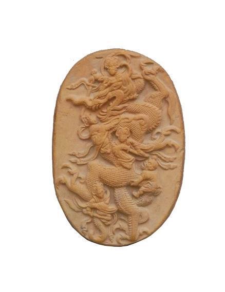 1990年出土于莊浪縣水洛鎮(zhèn)寺坪塬遺址。高11.7厘米,寬7.9厘米,厚1.5厘米,呈橢圓形。泥質(zhì)紅陶,背面平素。畫面表現(xiàn)的是某神話故事,正面飾淺浮雕紋飾,正中為一巨龍張牙舞爪、怒目圓睜、奮力騰空,一女神左手緊抓龍角,右手持劍欲砍龍首;龍頸部有一女神拿繩索套縛,另一女神在龍胸部作拔劍狀;一力士則用力拽龍尾,凸目張嘴,聲色驚恐萬分;在龍的后肢旁還有一女神右手握劍砍殺。五神皆神態(tài)各異,造型逼真,生動(dòng)表現(xiàn)了五神伏龍時(shí)驚心動(dòng)魄的場(chǎng)景。