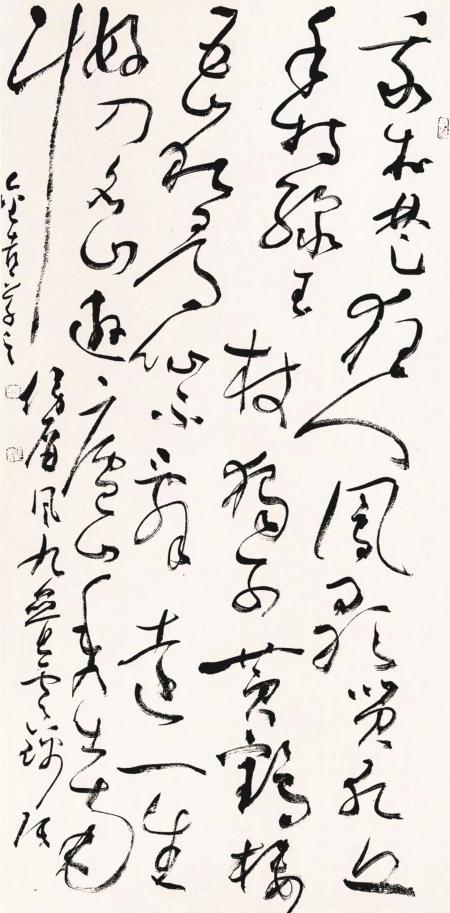 走出去,站在全國的高度,集中進(jìn)行學(xué)習(xí)和交流,對一個立志進(jìn)取的書法家,可以說是一個脫胎換骨的修煉,中國書法發(fā)展的當(dāng)代狀態(tài),成為進(jìn)取的最大參照,風(fēng)格極力貼近時代風(fēng)尚,在此基礎(chǔ)之上加入個人的鮮活語素,在作品中即表現(xiàn)出了時尚,又有自己的構(gòu)想,才有自己的一席之地。侯金喜抓住時代脈搏,積極捕捉在展覽中尚處于不顯眼的元素,不斷加以顯化,使個人的作品在龐大的展出體系中獨(dú)具風(fēng)采,難度可想而知,在高手如林的態(tài)勢下,侯金喜知難而上、刻苦磨煉,向經(jīng)典取法,向當(dāng)代名家問路,雙向融合、求新求變,經(jīng)過了這樣一個長的時段的求索,他的草書在全國眾多的草書家中拔地而起,引發(fā)了廣泛的關(guān)注。看他的草書,變化的度把握在了一個比較妥帖的度上,他不以奇異詭變?yōu)槌缟?,筆畫塑造大體以傳統(tǒng)語言為宗,使柔和與剛健統(tǒng)馭在一起,這種立意基本圍繞中國書法流變的中軸線,可以受到時間的考驗(yàn),在一些筆畫中注入的時代信息,經(jīng)過個人的藝術(shù)提煉,具有了新的生氣。在結(jié)構(gòu)選擇上,他同樣進(jìn)行了深思熟慮,反復(fù)篩汰了過度追求時髦的招數(shù),一直強(qiáng)調(diào)深層次的內(nèi)涵,把一個結(jié)體放在歷史的縱向上反復(fù)琢磨,他自己認(rèn)為,形象造型只有沿著時序的推進(jìn),才能有機(jī)地融入歷史,成為藝術(shù)的終極選擇,所以侯金喜的探索是審慎的,邁進(jìn)是疊復(fù)的,我們欣賞他的作品,可以看出他思考的勤謹(jǐn),每一個階段都有不同的表達(dá),欣賞者隨著他的筆觸的流瀉,可以領(lǐng)略到豐富的視覺享受。