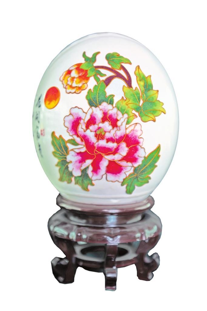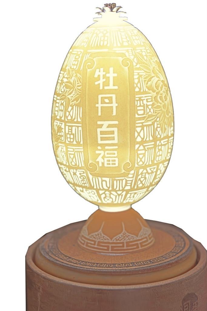 楊星國雕刻過的作品達(dá)兩千多件,作品《牡丹亭》是他用最新的拼雕手法創(chuàng)作的,鴕鳥蛋殼細(xì)分成300片,打磨成“瓦片”樣,逐片貼成古建筑中亭頂蓋狀,形成牡丹亭之樣,做成外層的“亭”;內(nèi)層的“牡丹”則用鴯鹋蛋殼,利用其自然色,依照牡丹層層雕透,第一層深墨、第二層墨綠、第三層淡綠、第四層白色從外到內(nèi)雕刻,作品既有國畫的神韻又有雕刻的立體藝術(shù)之美。浮雕、陰雕、陽雕、鏤空雕、拼雕等手法,在《牡丹亭》作品里全部顯現(xiàn)。為了讓作品表達(dá)的效果更充分,楊星國又加了一些機(jī)械原理讓其旋轉(zhuǎn),還加了燈光,于是,3個(gè)鴕鳥蛋殼與1個(gè)鴯鹋蛋殼在楊星國的巧妙構(gòu)思中有了全新的生命。