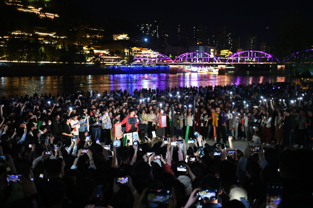 4月26日,游客在蘭州黃河食渡文旅美食街觀看演出。新華社記者 郎兵兵 攝