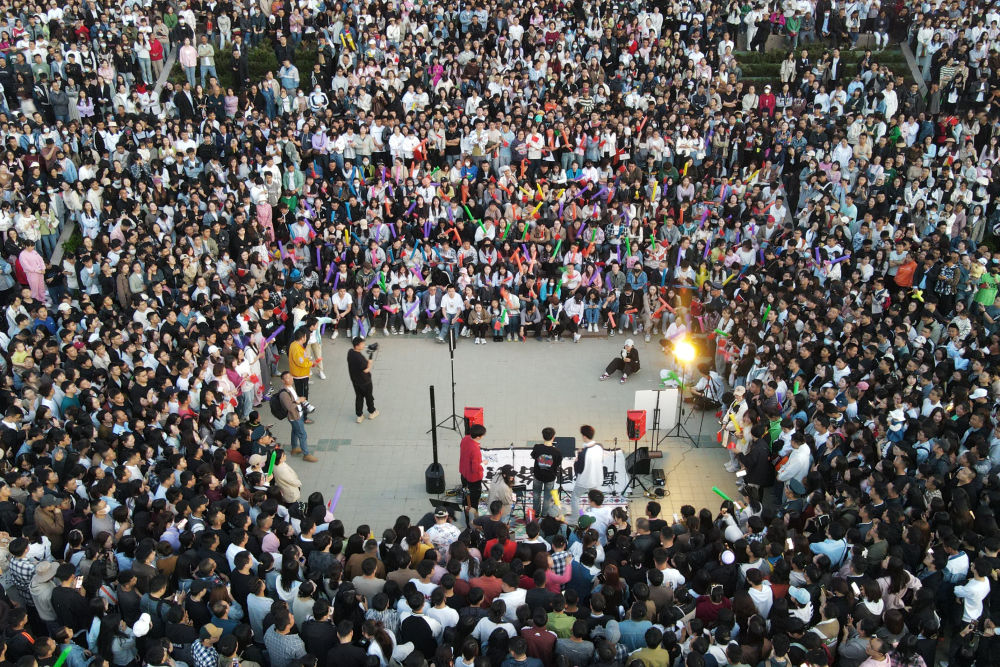 “最近在短視頻平臺(tái)上‘蘭州黃河大合唱’的話題很火,我們刷到后就趕過(guò)來(lái)了。現(xiàn)場(chǎng)人山人海,氛圍感拉滿,有種露天現(xiàn)場(chǎng)酒吧的感覺(jué)。”趁著周末,來(lái)自蘭州城市學(xué)院的大學(xué)生陳佳儀和4名好友,相約打卡這個(gè)蘭州夜游新地標(biāo),感受黃河之濱的青春與活力。