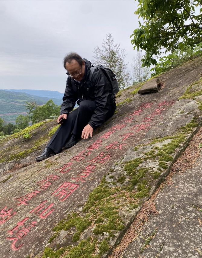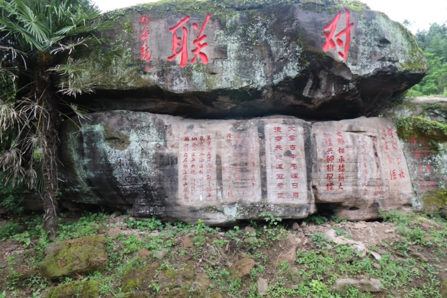 山上隨處是石,或臥或立,俱有雄獅虎豹之勢(shì);或平或峻,皆作岡陵之態(tài)。青峰續(xù)脈,絕頂鷹飛。鑿巖壁以造法像,栩栩如臨宮闕;摩巨石而鐫嘉聯(lián),文華直射牛斗。石多瑰偉,苔覆璞瑜,油菜花點(diǎn)綴其間,引來蜜蜂蝴蝶共舞。山茶與毛竹同畦,郁郁蔥蔥;峰巒與云煙共養(yǎng),莽莽蒼蒼。遇目石上鐫字,瀏賞翰墨煙霞;振藻揚(yáng)毫,皆寰中俊杰;椽筆斯文,多隴蜀賢達(dá)。或赤子肝膽,燭照于史;或凜然浩氣,嘯傲大千。聯(lián)壁生輝,文曲星彰;峣巖開竅,氣通神明。文采煥然與星河同輝,詩(shī)儕競(jìng)秀潤(rùn)厚山玉顏。壯懷詩(shī)夢(mèng),漱玉溪流。在一塊巨石斜面上,有同伴發(fā)現(xiàn)刻有筆者所書長(zhǎng)聯(lián),興奮得喊叫起來。這是三年前應(yīng)曹興章先生之約而作,聯(lián)曰:翰墨生輝,千秋勝景開仙境;源泉流韻,萬象韶光耀厚山。我用手指扣去筆畫生出的茂密青苔,坐下來與我的聯(lián)合影留念。信是蓮花開石上,遙遙至此結(jié)仙緣。