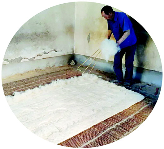 他一邊介紹一邊演示,先用白土揉進羊毛,吸掉油氣,再用彈弓加工松軟,并用手拍打鋪放均勻。搟氈前,還要撒面粉,通常中等大小的毛氈摻兩斤多面粉,以增加黏性和柔性。之后還要淋上開水,高溫瞬間會使羊毛變軟。