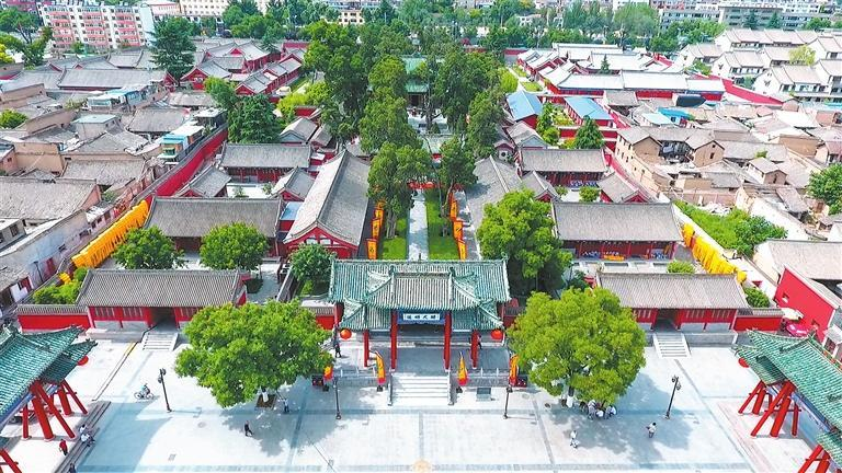 伏羲廟,位于天水市秦州區(qū),又名“太昊宮”,俗稱“人宗廟”,是一座專門祭祀中華人文始祖太昊伏羲氏的明代宗廟建筑群。現(xiàn)存建筑建于明成化十九年(公元1483年),是目前我國保存最為完整、建筑年代最早的祭祀伏羲氏的廟宇,其建筑群呈宮殿式建筑模式,整個建筑群坐北朝南,牌坊、宮門、儀門、先天殿、太極殿沿縱軸線依次排列,層層推進,莊嚴雄偉,并有碑廊、鐘鼓樓等多處建筑,為全國重點文物保護單位。因其周圍皆是明清和民國時期的民居建筑群落,便有了慕壽祺聯(lián)中的“萬山都近圣人居”之說。