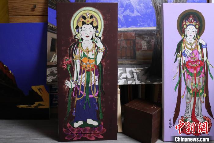 北京外國(guó)語(yǔ)大學(xué)藝術(shù)研究院院長(zhǎng)寧強(qiáng)以敦煌莫高窟壁畫(huà)為靈感創(chuàng)作的繪畫(huà)作品。 徐雪瑩 攝