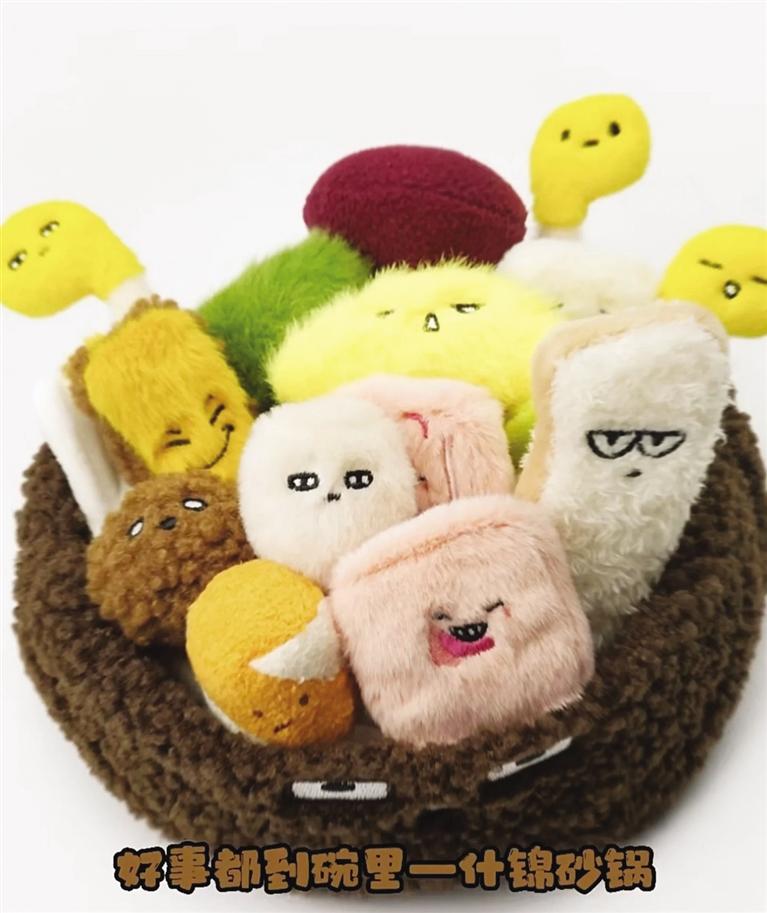 記者看到,“麻辣燙”和“砂鍋”毛絨玩具花束有多個單品,模擬了丸子、蟹排、年糕、香菇等菜品。而且每款都有自己的名字——嘻嘻西蘭花、香香香菇、黏黏年糕、哇哇菜、謝謝蟹排、玩去吧丸子??蓯塾腥さ拿q玩具再次走紅網(wǎng)絡(luò),成為不少“大朋友”的必入文創(chuàng)單品。連日來,這款單品引發(fā)近20萬人涌入天貓旗艦店搶購,“麻辣燙”幾度售罄。甘肅省博物館文創(chuàng)中心負(fù)責(zé)人崔又心介紹,“麻辣燙”火了之后,天貓店客服每天都會收到來自消費(fèi)者“求補(bǔ)貨”留言。