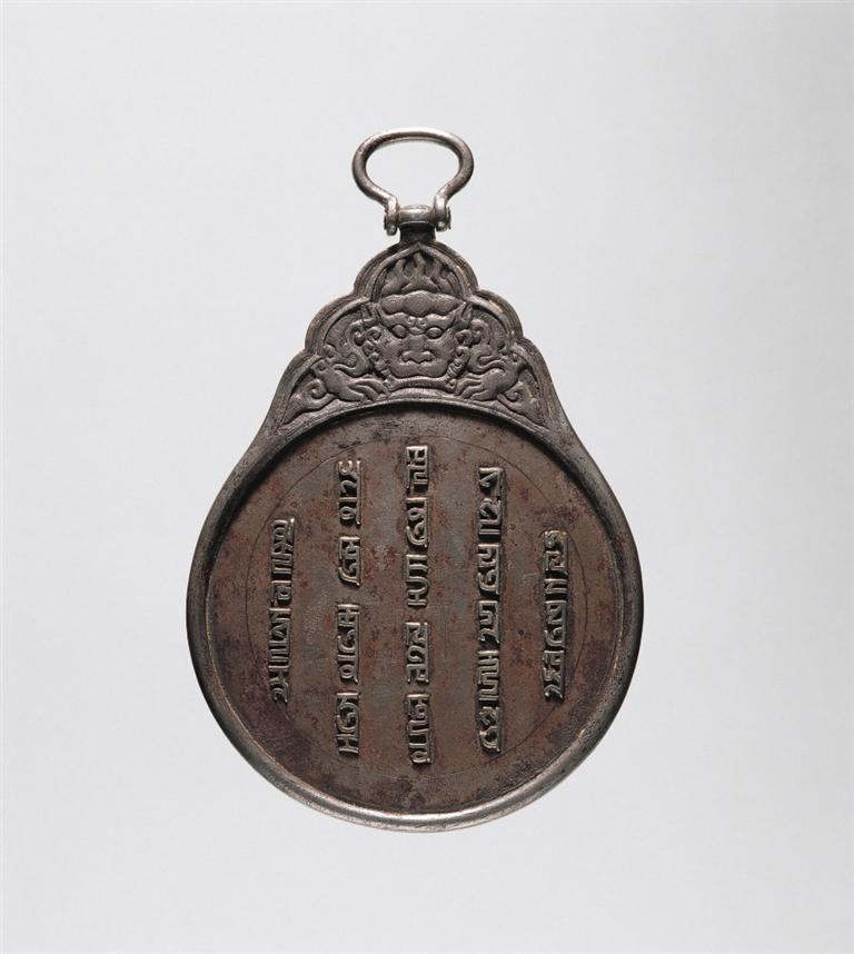 八思巴文虎頭銀符鐵牌,元代,符牌兩面鑲嵌八思巴文銀字,譯為“上天眷命,皇帝聖旨:如不欽奉虔敬,治罪”。廓外上有葉狀鈕座,座內(nèi)鑄虎頭紋,座頂有橢圓形環(huán)鈕。這種虎符圓牌專為傳遞“軍情急務(wù)”而設(shè),持之可進(jìn)出全國各地及四大汗國,域跨歐亞,故有“國際通行證”之稱,是研究元代急遞制度以及政治史、民族文字等方面的珍貴實物資料。這種符牌使用范圍十分嚴(yán)格,故全世界現(xiàn)存數(shù)量極少。