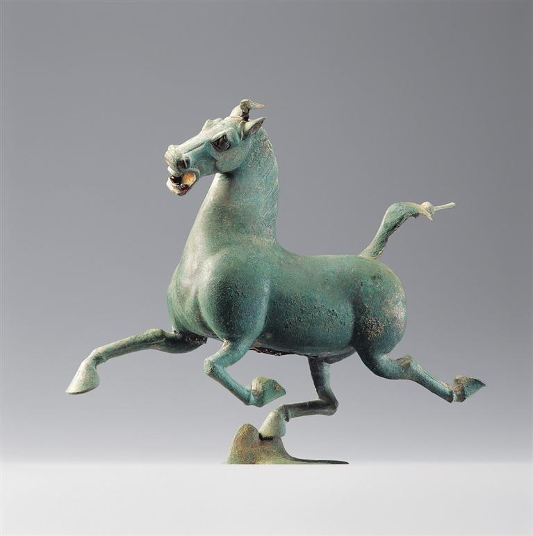 銅奔馬,東漢,1969年武威市雷臺墓出土。馬作奔騰狀,三足騰空,右后蹄踏一展翅飛翔、回首驚顧的飛鳥。奔馬全身著力點集于超掠飛鳥的一足之上,準(zhǔn)確地把握了力學(xué)平衡。蹄踏飛鳥,表現(xiàn)出馬行迅疾,在鳥驚回首的剎那已經(jīng)超越了飛行的鳥。銅奔馬鑄造精美,構(gòu)思巧妙,為我國青銅藝術(shù)中罕見的杰作,1983年被確定為中國旅游標(biāo)志,2002年被國家文物局列入首批禁止出國(境)展覽文物目錄。它以卓絕的藝術(shù)造詣千古生輝,成為中華民族勇往直前、積極進(jìn)取偉大氣質(zhì)的象征。