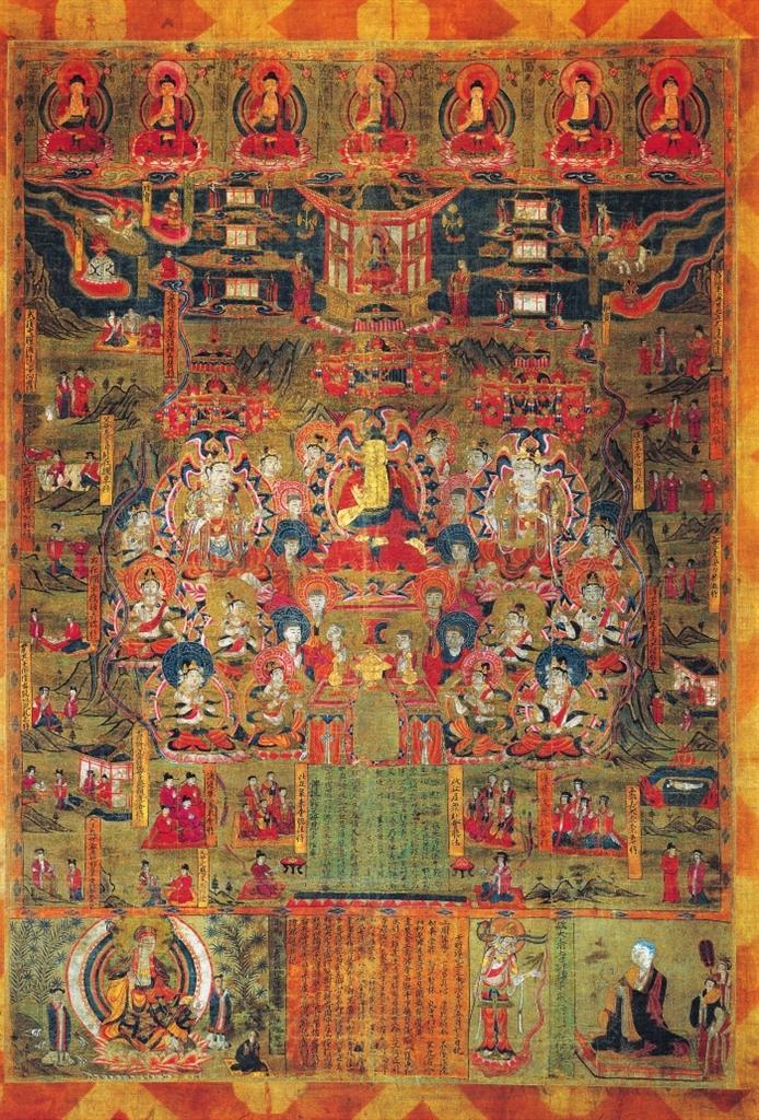 該畫為絹地設(shè)色,出自敦煌莫高窟藏經(jīng)洞。畫面中心為說法圖,一佛二菩薩法相莊嚴(yán),諸菩薩、弟子、比丘、比丘尼、優(yōu)婆塞、優(yōu)婆夷等“赴會圣眾”圍繞周圍。兩側(cè)及上方分布15幅經(jīng)變故事圖,以連環(huán)畫形式鋪陳展現(xiàn)《佛說父母恩重經(jīng)》的基本內(nèi)容。其上繪七佛、彌勒與七寶,其下墨書《佛說報父母恩重經(jīng)變》。絹畫最下方自左向右排布地藏菩薩、《繪佛邈真紀(jì)》、引路菩薩及比丘尼戒行邈真像。該絹畫保存完整,色彩絢麗,是敦煌《佛說父母恩重經(jīng)》諸變相中,內(nèi)容最復(fù)雜,畫面情節(jié)最多,特點最鮮明,風(fēng)格最獨特的一幅,且有宋淳化二年(公元991年)明確紀(jì)年,具有重要的歷史、藝術(shù)和研究價值。