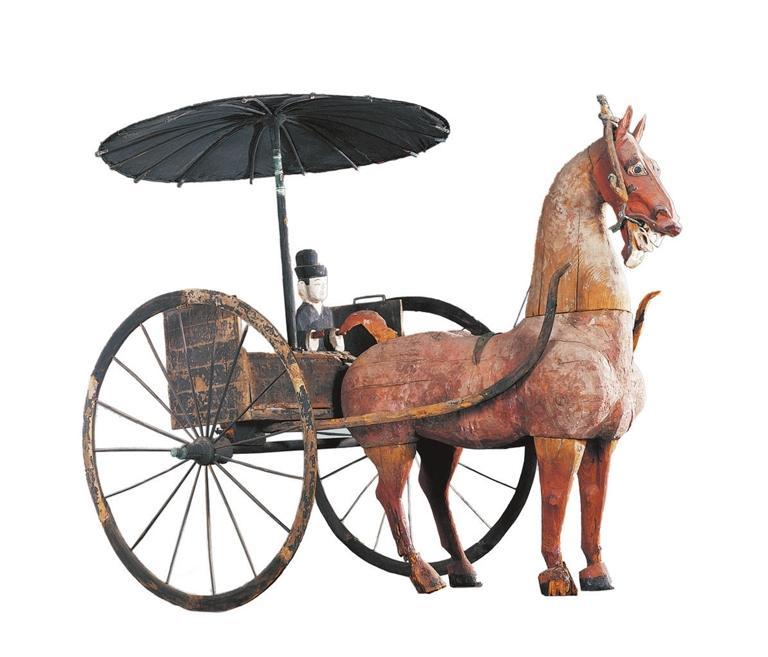 彩繪木軺車,西漢,武威磨嘴子出土。軺車由輿車、傘蓋、御奴和馬組成,是迄今為止發(fā)現(xiàn)最大的漢代木雕作品,也是現(xiàn)存漢代木軺車馬保存較為完好的一件,對于研究漢代車輿和封建等級制度提供了極為難得的資料。據(jù)漢代制度,推斷墓主人生前為六百石至千石的官吏。