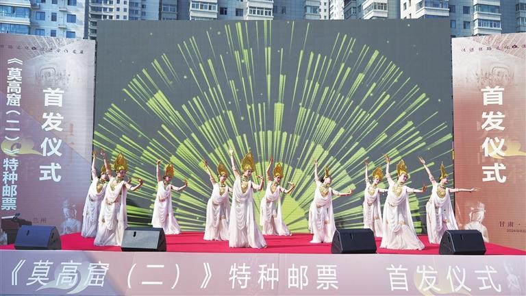 敦煌文化博大精深,敦煌舞蹈美輪美奐。首發(fā)儀式上,舞者身著飄逸的古裝,頭戴華麗的發(fā)飾,手持飄帶,仿佛從天而降的仙子。她們?cè)谝魳?lè)的伴奏下,翩翩起舞,輕盈如燕,婉約如風(fēng),一曲《千手觀(guān)音》拉開(kāi)了《莫高窟(二)》特種郵票發(fā)行儀式的序幕。