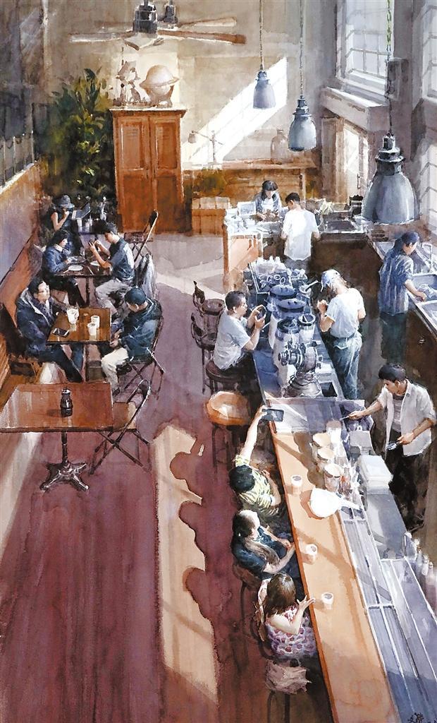 《網紅咖啡館的午后》用寫實方法展現了一個溫馨的生活場景。在構圖上,以俯視的角度用大場景來做整體畫面的籌劃,在整體色調上以沉穩(wěn)厚重的暖色作為基調,把光線穿插、引入到畫面中。在布局上,以陽光照耀下的咖啡館吧臺為主要表現組群,分別刻畫、塑造了工作中的前臺人員、打卡拍照的女性顧客群;把暗部區(qū)域,幾組在咖啡桌邊交談、用餐、喝咖啡的顧客群作為第二層次,展現他們不同的神情和體態(tài);然后完善整體的空間感。在用筆上盡量以松動的筆觸,又能展現細節(jié)的方式來塑造,利用水彩畫需要干、濕、松、緊相結合,多層次、多遍數進行渲染的特性,盡可能達到預期效果。 (本版文圖由甘肅省美術家協會提供)